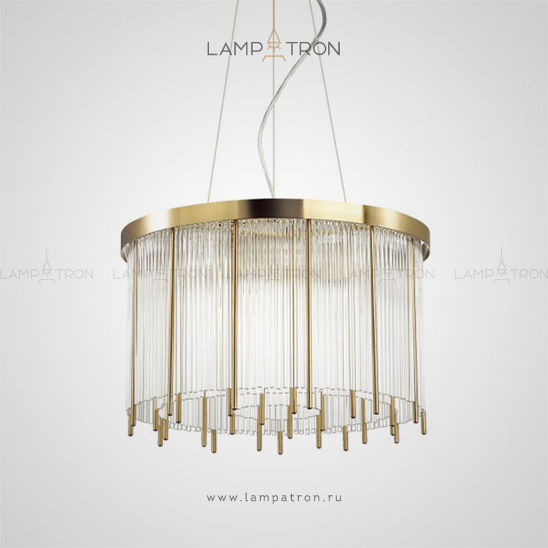 Люстра в стиле Модерн на струнном подвесе с кольцевым каркасом латунного цвета и абажуром из комбинации стеклянных и металлических стержней
