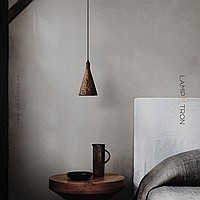 Серия подвесных светильников с рельефным латунным корпусом геометрической формы и деревянной отделкой