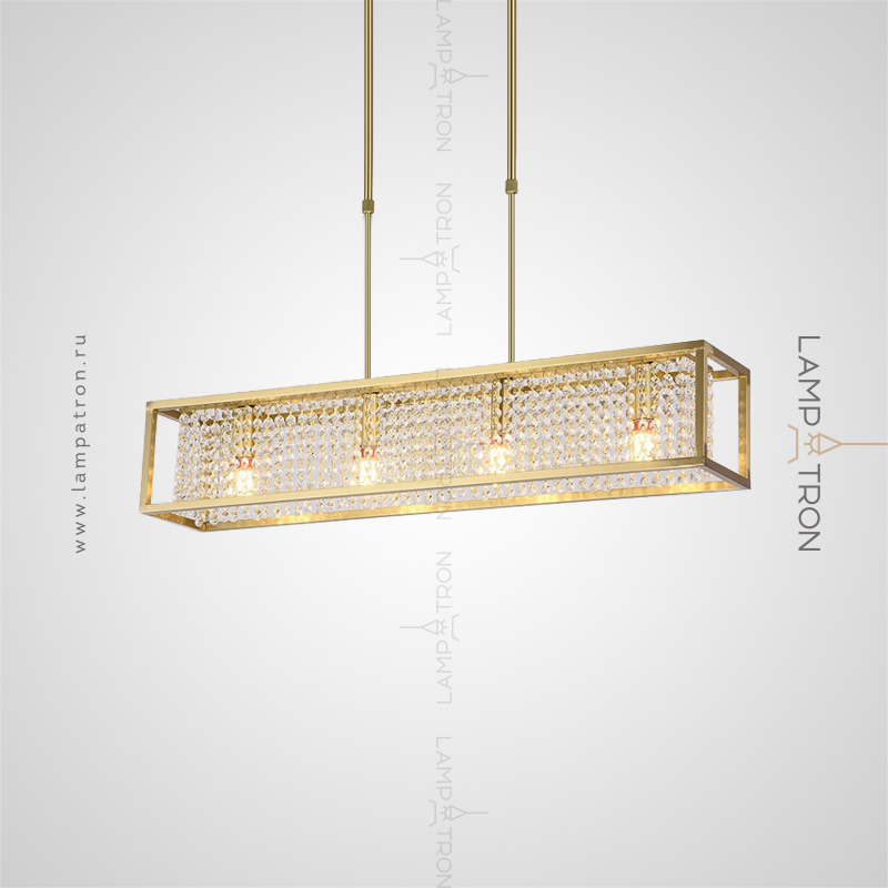 Рядный светильник с абажуром из свободно свисающих кристальных подвесок внутри прямоугольного каркаса из металла