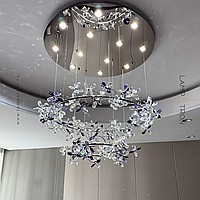 Серия инсталляций в виде сферических композиций из подвесных хрустальных элементов в форме цветков на потолочном дисковом основании с точечными источниками света