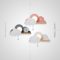 Серия настенных светильников с белым шарообразным плафоном на деревянной полочке с декоративными облаками