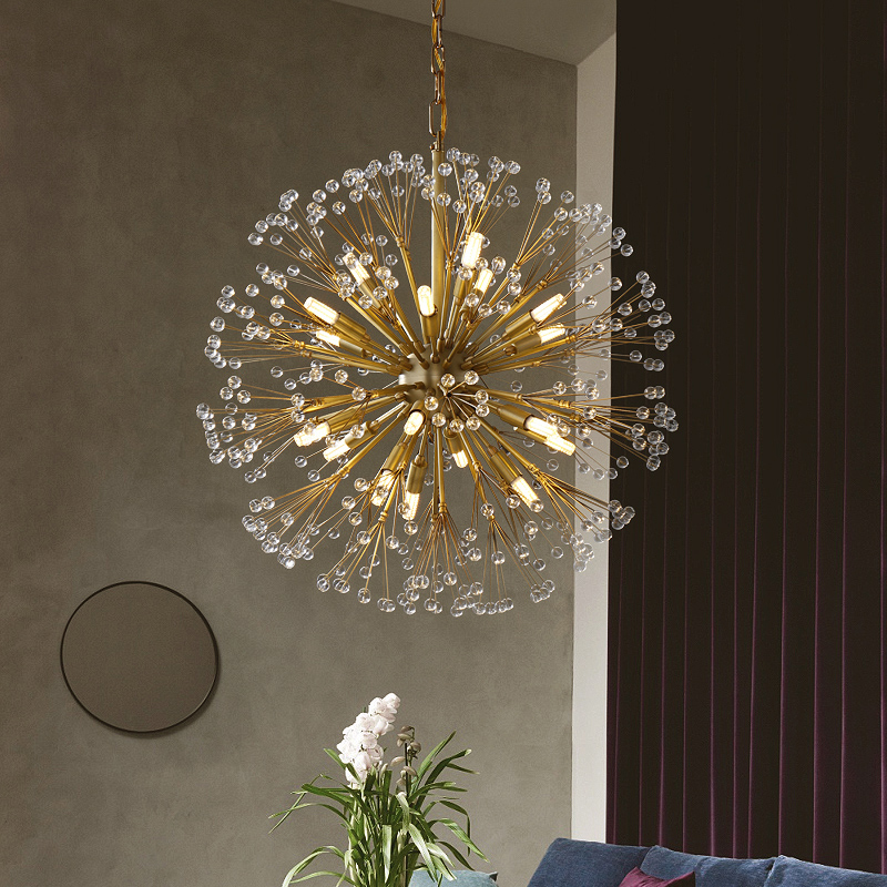 Серия подвесных люстр в виде латунного шара с радиально расходящимися стержнями с хрустальным декором на концах