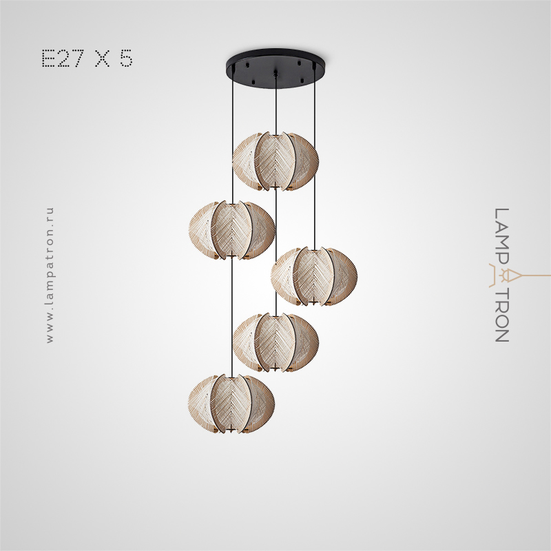 Готовая комбинация подвесных светильников с нитевыми абажурами на основании из светлого дерева