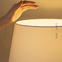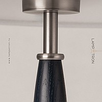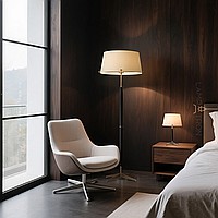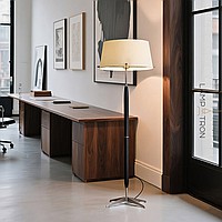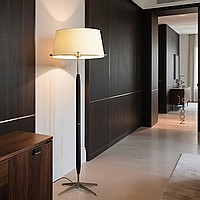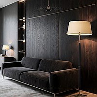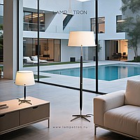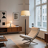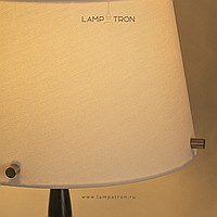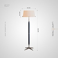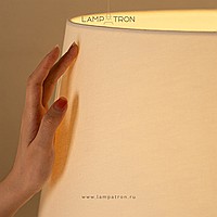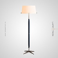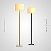 Торшер в минималистичном стиле с трапециевидным текстильным абажуром на деревянной стойке