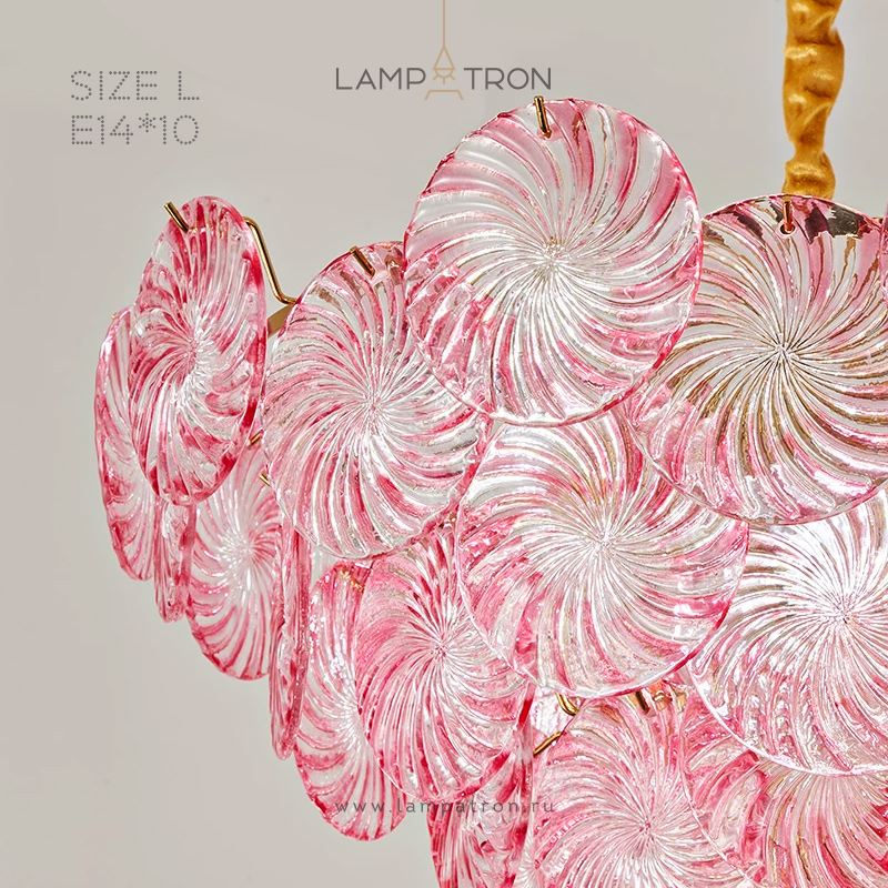 Серия люстр с подвесками из стеклянных дисков различных оттенков с дымчатым или спиралевидным узором