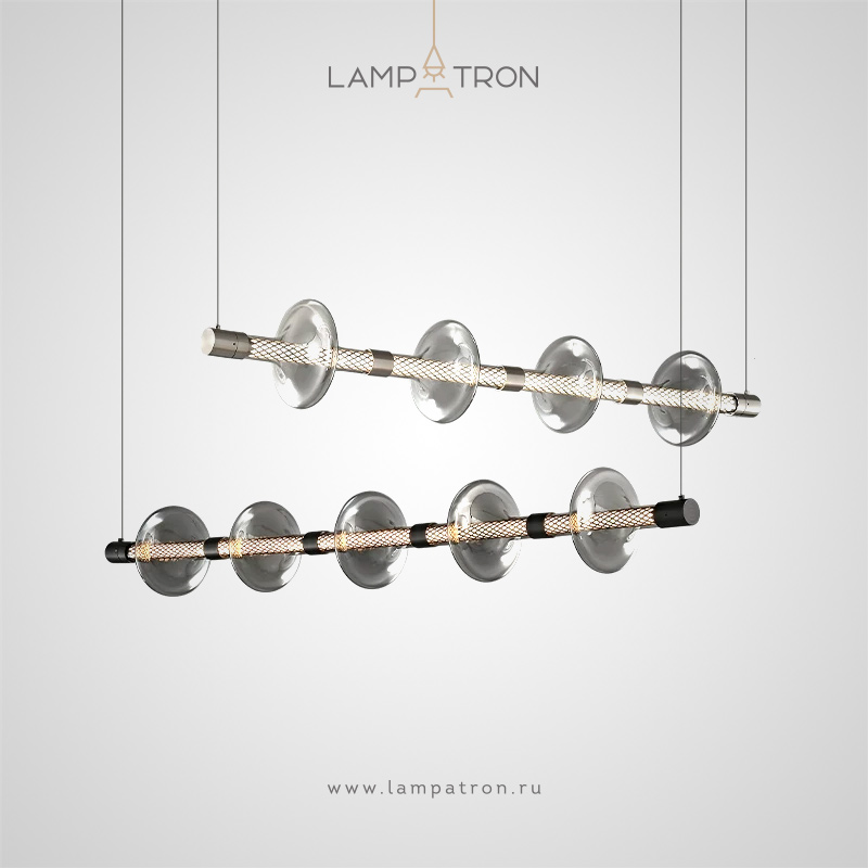 Серия реечных светильников в виде светодиодной трубки с сетчатым рассеивателем и фигурным плафоном из дымчатого стекла