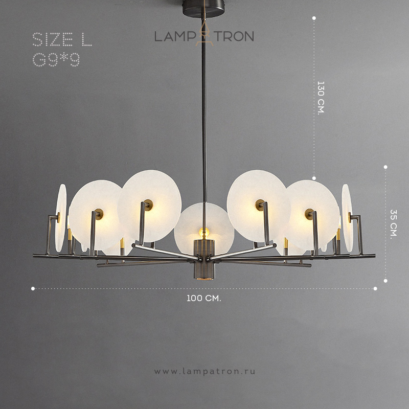 Материал: Металл, Мрамор Цвет корпуса: Черненая бронза Размеры: (Диаметр × Высота) Размер S: Ø 80 × 35 см. Размер M: Ø 90 × 35 см. Размер L: Ø 100 × 35 см. Длина подвеса: 130 см (регулируется) Тип цоколя: G9 Цветовая температура: Теплый свет