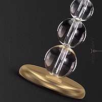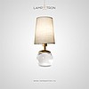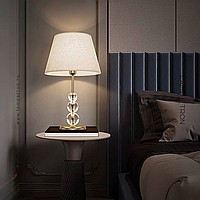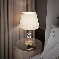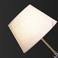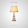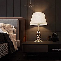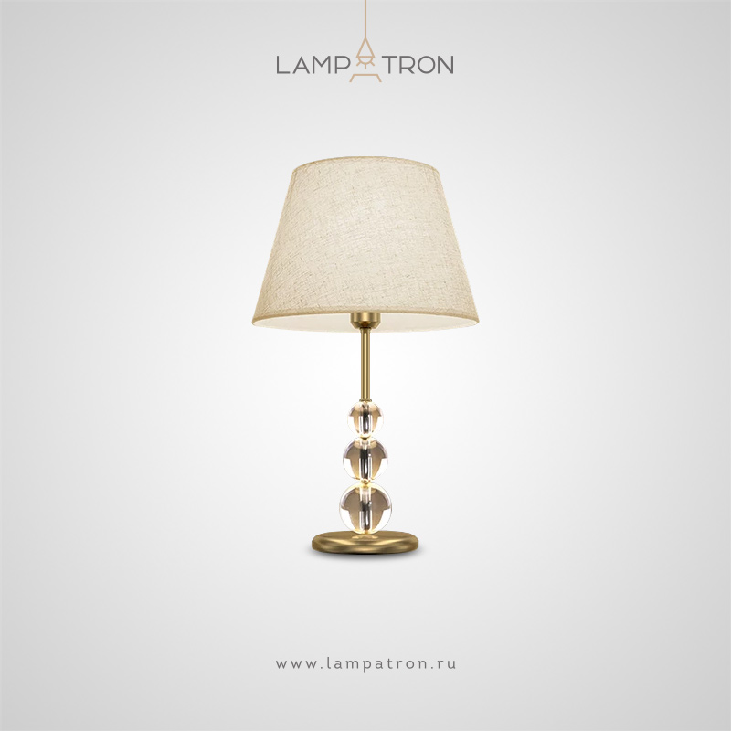 Настольная лампа с текстильным абажуром на вертикальной стойке в виде пирамиды из хрустальных шаров