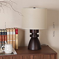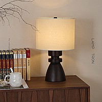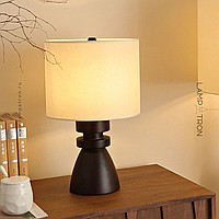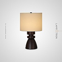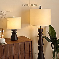 Дизайнерская настольная лампа с массивным фигурным корпусом из цельного дерева и текстильным цилиндрическим абажуром