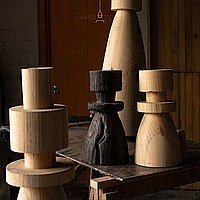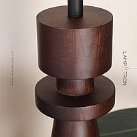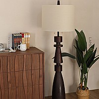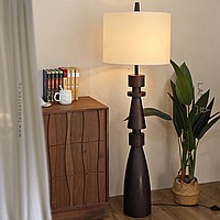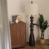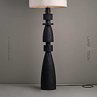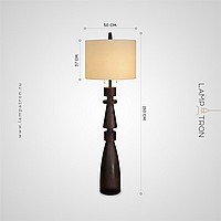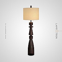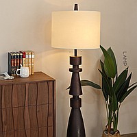 Дизайнерский торшер с массивным фигурным корпусом из цельного дерева и текстильным цилиндрическим абажуром