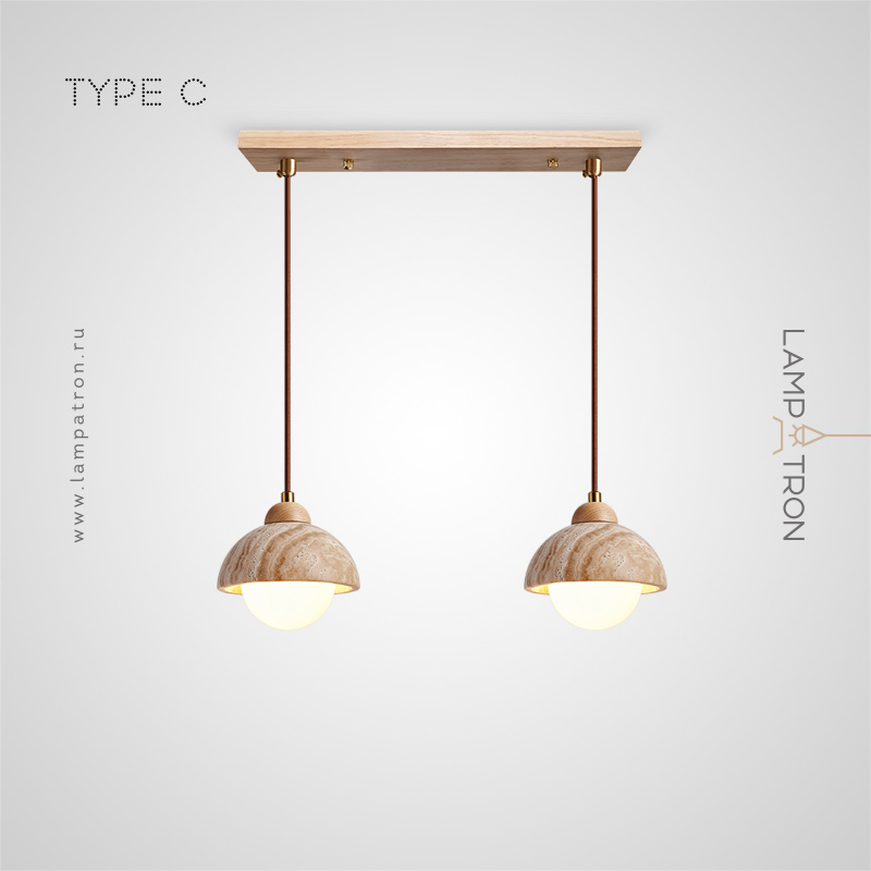 Готовая комбинация подвесных светильников с цилиндрическим и купольным абажуром из камня травертина с деревянным цокалем