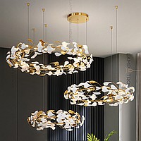 Серия дизайнерских люстр в виде комбинации колец с белыми и латунными рассеивателями, имитирующими листья гинкго