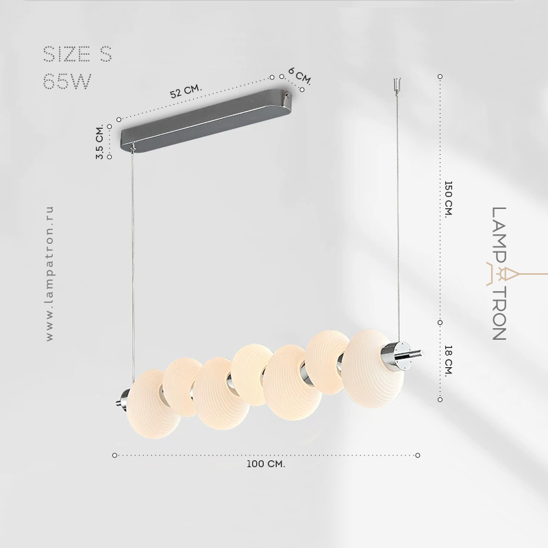 Серия реечных светодиодных светильников с рифлеными шарообразными плафонами на искривленном цилиндрическом стержне