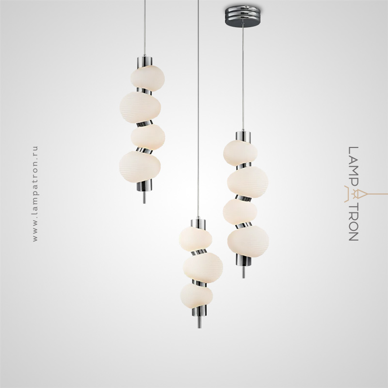 Серия подвесных светодиодных светильников с рифлеными шарообразными плафонами на искривленном цилиндрическом стержне