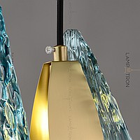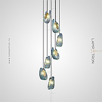 Каскадная комбинация светильников с рельефными стеклянными рассеивателями голубого цвета форме изогнутых лепестков