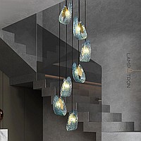 Эта готовая каскадная светильниковая композиция с семьёй изогнутых стеклянных рассеивателей голубого цвета, выполненных в форме лепестков, создаёт эффект рельефа и динамики на потолке в интерьере в стиле модерн. Металлический корпус с латунным покрытием добавляет изделию элегантности и уюта, подчёркивая атмосферу современного минимализма. Такое решение отлично подойдет для просторной гостиной или высокого холла, где мягкое рассеянное освещение поможет создать расслабляющую, эстетически насыщенную обстановку. Готовая композиция легко интегрируется в интерьер, подчёркивая его стильные линии и добавляя уникальный штрих в дизайн. Обнови свой интерьер, купи или закажи эту модель и подчеркни актуальность пространства в тренде 2025 года.