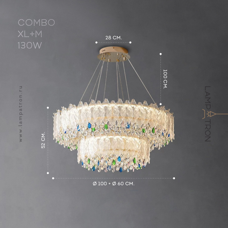 Серия люстр с рассеивателями из стеклянных листьев и каплевидными подвесками из цветного хрусталя