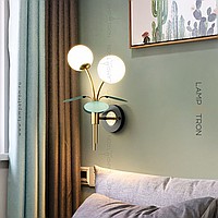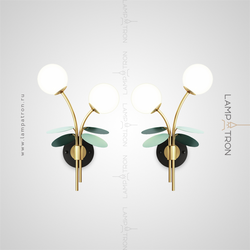 Серия бра с двумя белыми шарообразными плафонами и голубыми декоративными дисками на изогнутых рожках