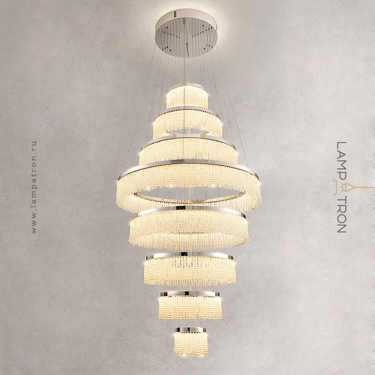 Каскадная люстра из светодиодных колец разного диаметра с декором из хрустальных бусин