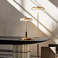 Напольный светодиодный светильник со стеклянным дисковидным рассеивателем на стойке из латуни и дерева