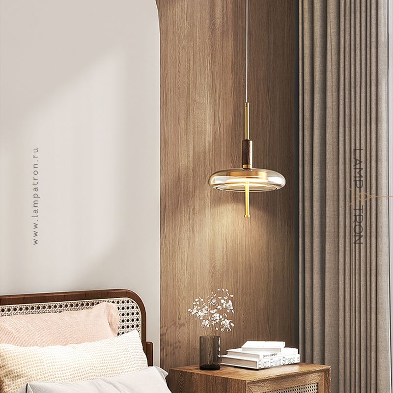 Подвесной светодиодный светильник со стеклянным дисковидным рассеивателем на ножке из латуни и дерева