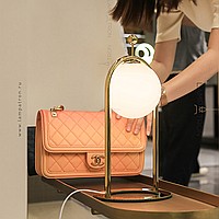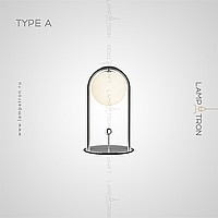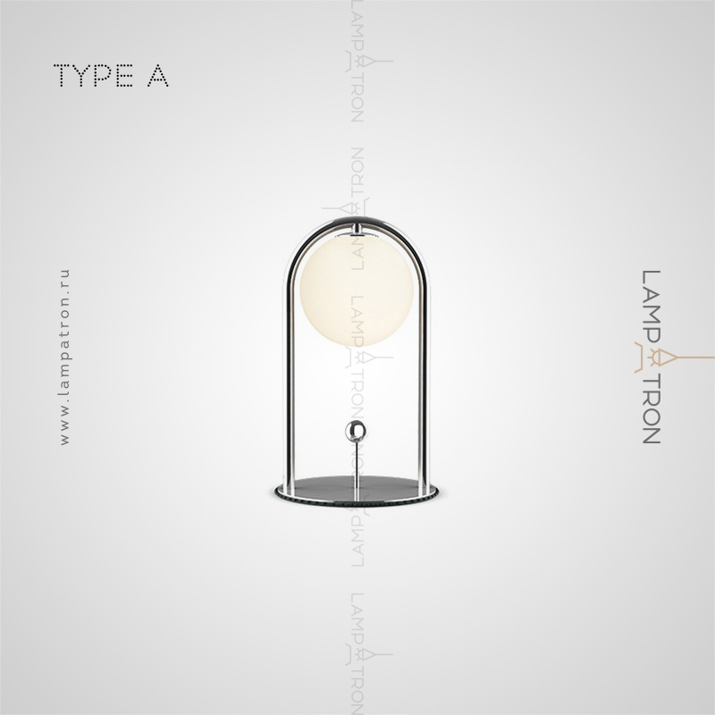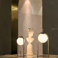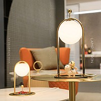 Серия настольных ламп с шарообразными матовыми плафонами внутри металлической рамки и кнопкой регулирования цветовой температуры на шнуре