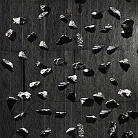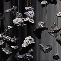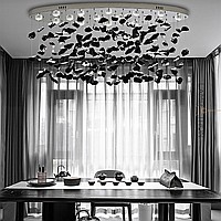 Серия светодиодных инсталляций в виде подвесных элементов неправильной формы из цветного и прозрачного стекла на овальном потолочном основании с точечными источниками