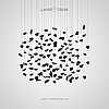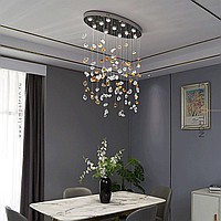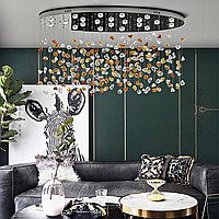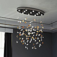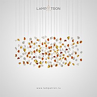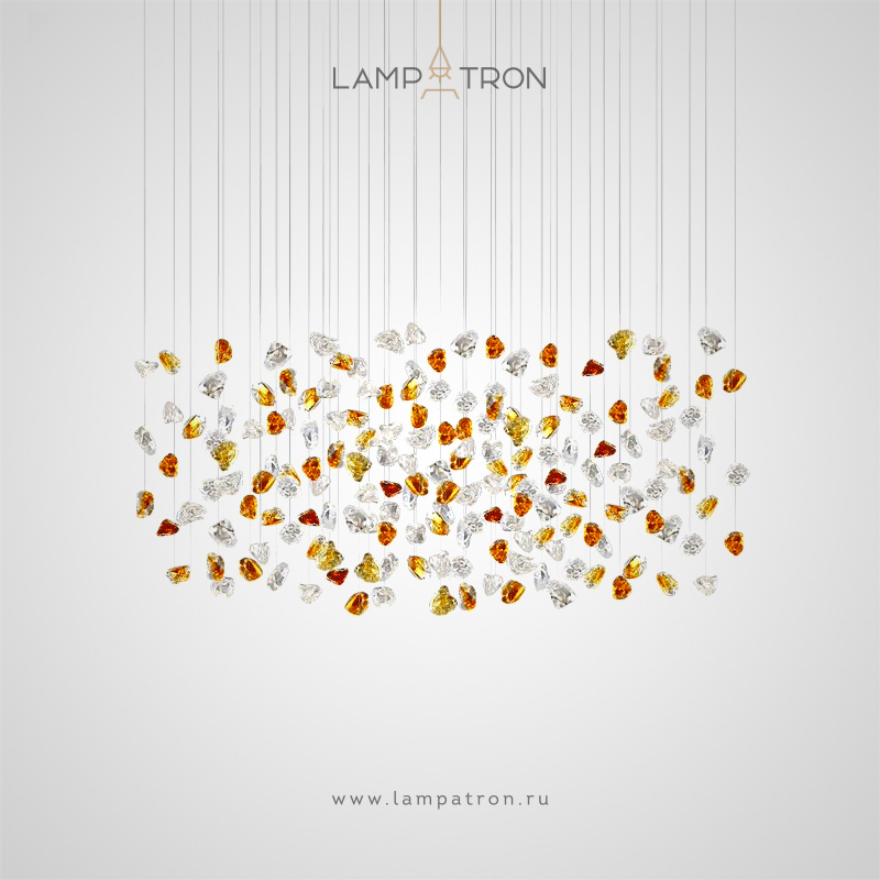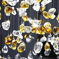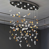 Серия светодиодных инсталляций в виде подвесных элементов неправильной формы из цветного и прозрачного стекла на овальном потолочном основании с точечными источниками