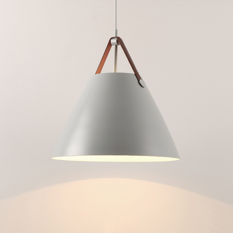 Светильник в скандинавском стиле конической формы с кожаным ремешком в качестве подвеса. Легкость и простота дизайнерского решения — нордический подход и сдержанность!