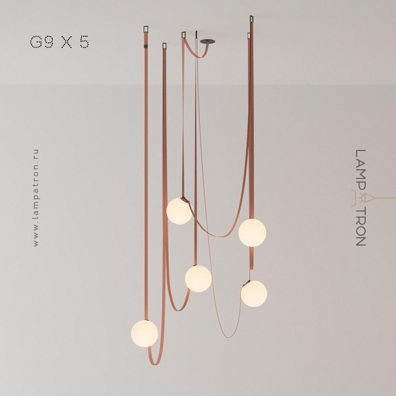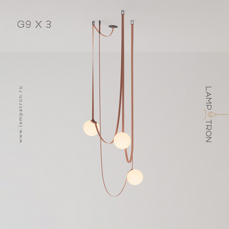 Серия подвесных светильников с белыми шарообразными плафонами из стекла на кожаных ремнях