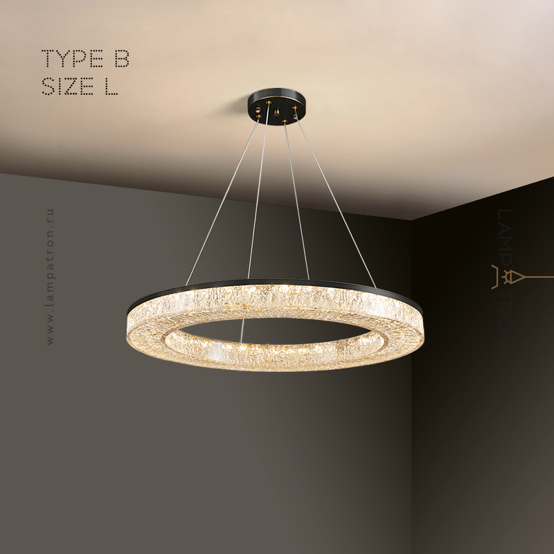 Серия светодиодных люстр с полупрозрачным рассеивателем с эффектом льда на кольцевом корпусе из латуни