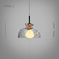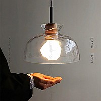 Серия подвесных светильников с рельефными плафонами разной формы из выдувного стекла с деревянным цоколем