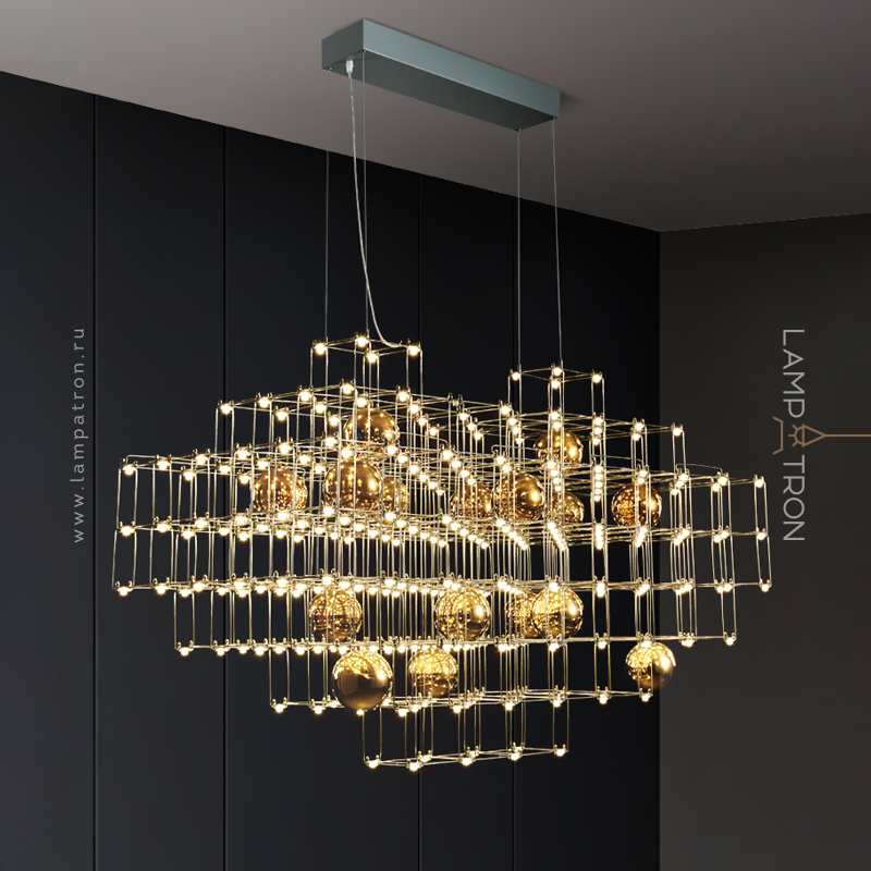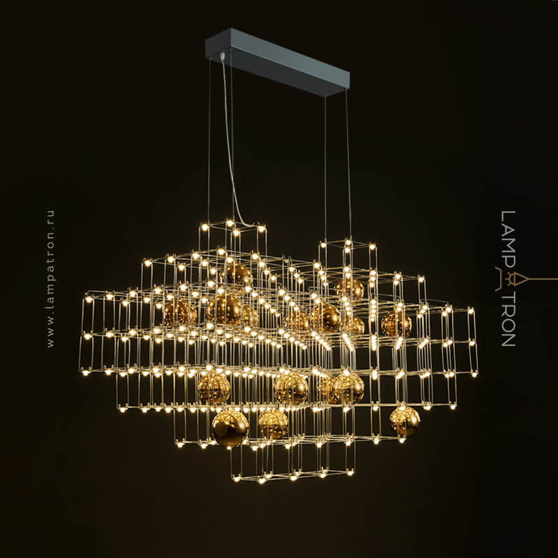 Дизайнерская люстра с точечными источниками и декоративными шарами на решетчатом каркасе