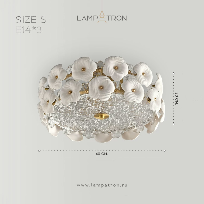 Потолочная люстра с рассеивателем из стекла с эффектом льда и керамическим декором в виде белых цветов
