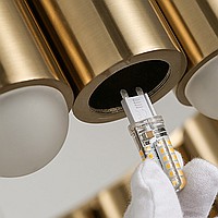 Люстра в стиле постмодерн с радиальной конструкцией из трубок, в которых размещены светодиодные источники света с полусферическими матовыми светофильтрами.