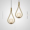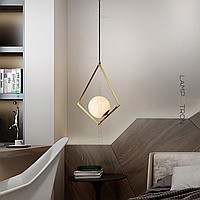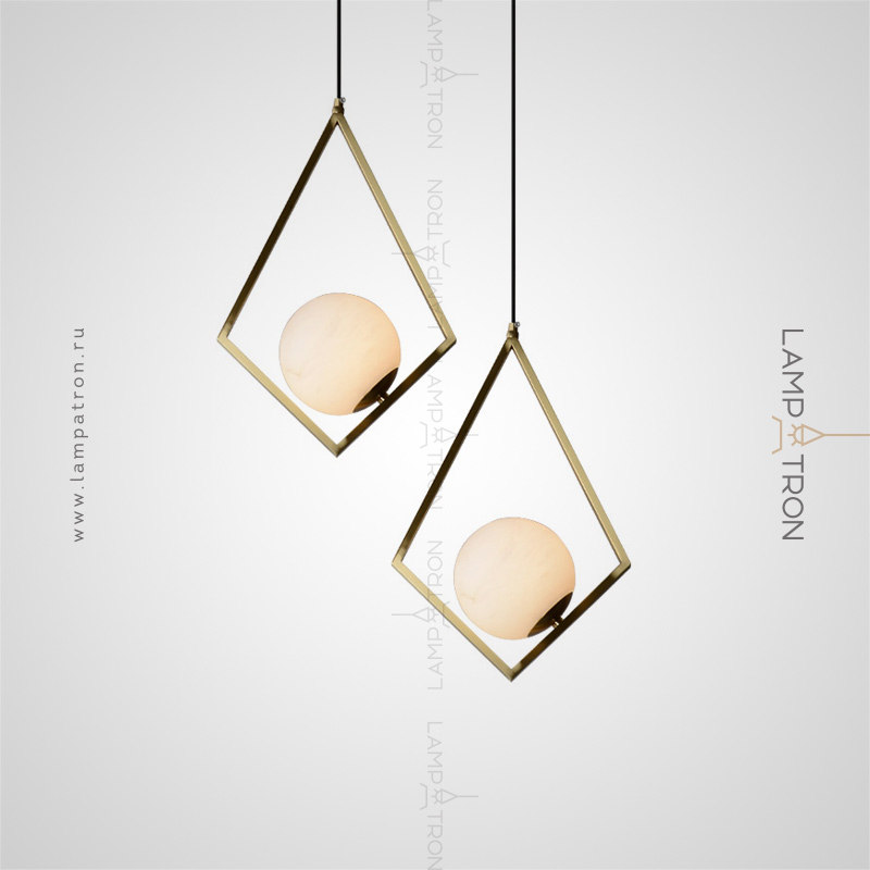 Подвесной светильник с шарообразным плафоном из мрамора внутри металлической рамки в форме ромба