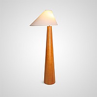 Напольный светильник с трапециевидным текстильным абажуром на коническом основании из цельного дерева