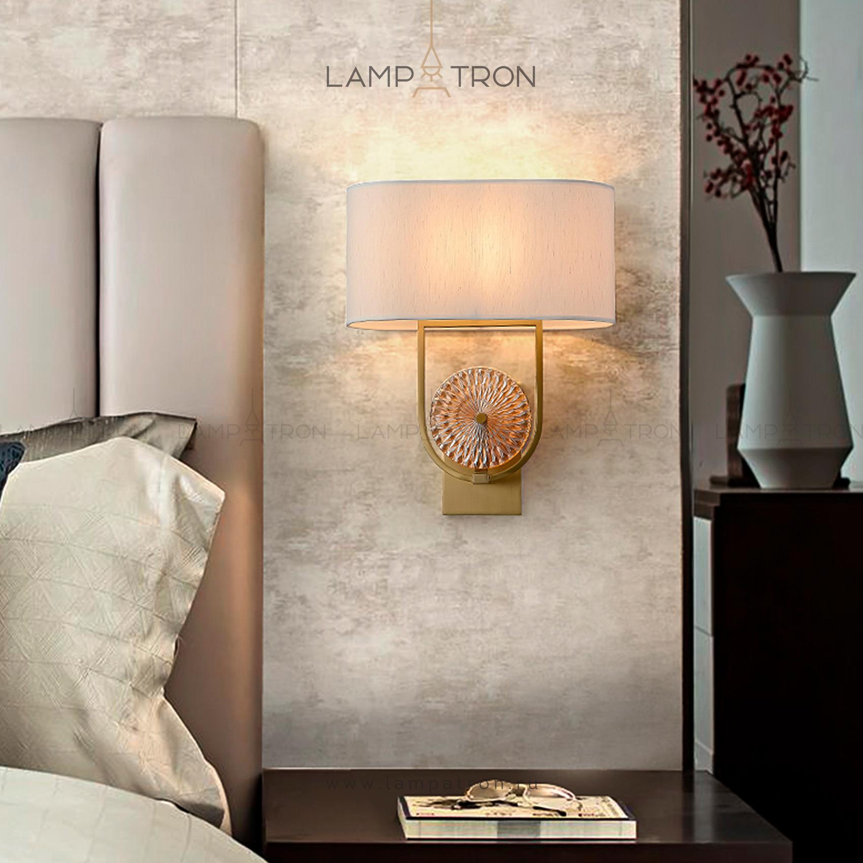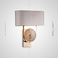 Настенный светильник с текстильным плафоном прямоугольной формы и декором в виде узорчатого диска из стекла