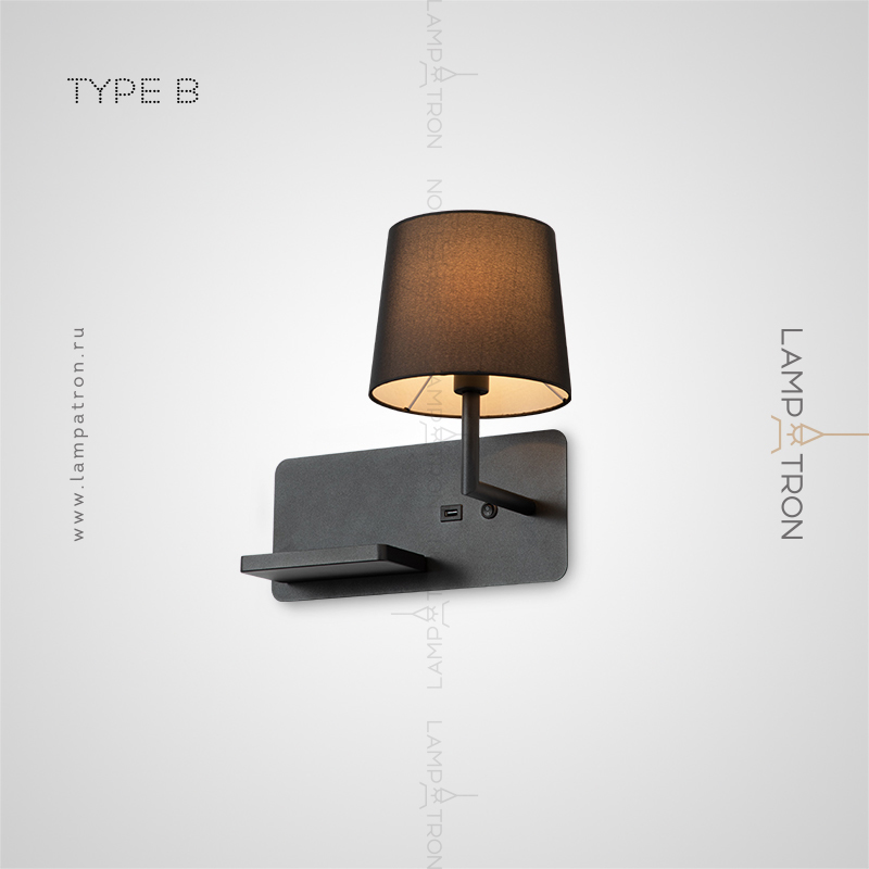 Серия настенных светильников с текстильным цилиндрическим абажуром на прямоугольном основании с предметной полочкой