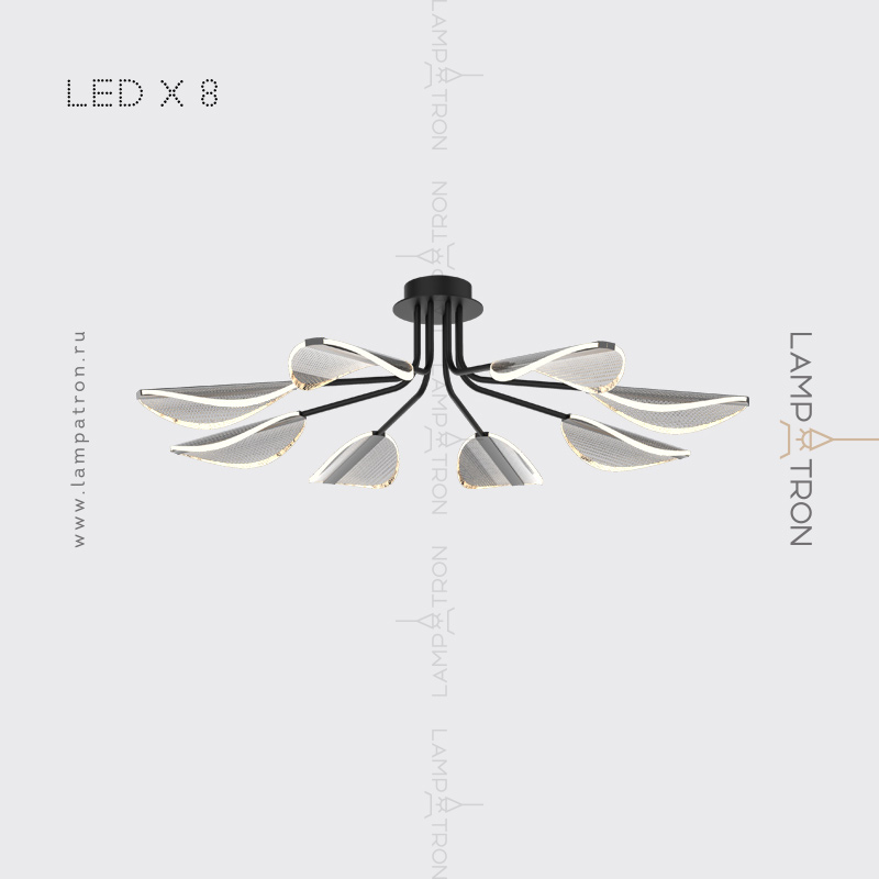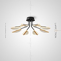 Серия потолочных светодиодных люстр с прозрачными листовидными плафонами с черными и латунными перегородками на лучевом каркасе