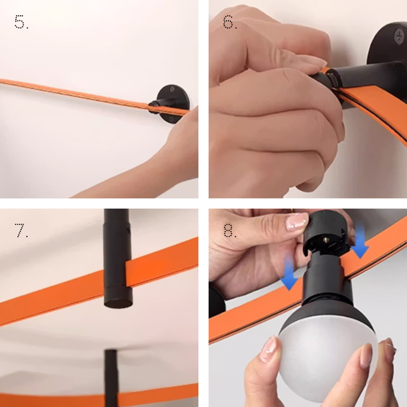 Треки имеют встроенную линию питания, которая закрепляется и растягивается между крепежных элементов.
